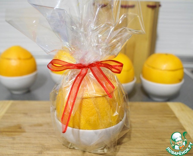 Также понадобятся кулинарные пакеты или целофан наподобие того, в который заворачивают цветы. В центр квадратного куска такого целофана поставить пиалу с апельсином,