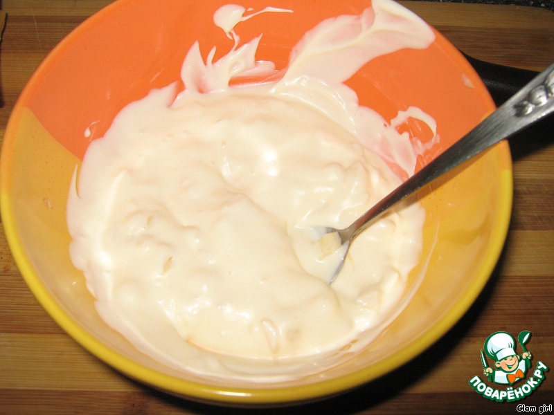 Смешиваем чеснок и майонез для получения соуса. В соус желательно добавить и зелень - получится вкуснее. У меня, к сожалению, не оказалось ее под рукой.