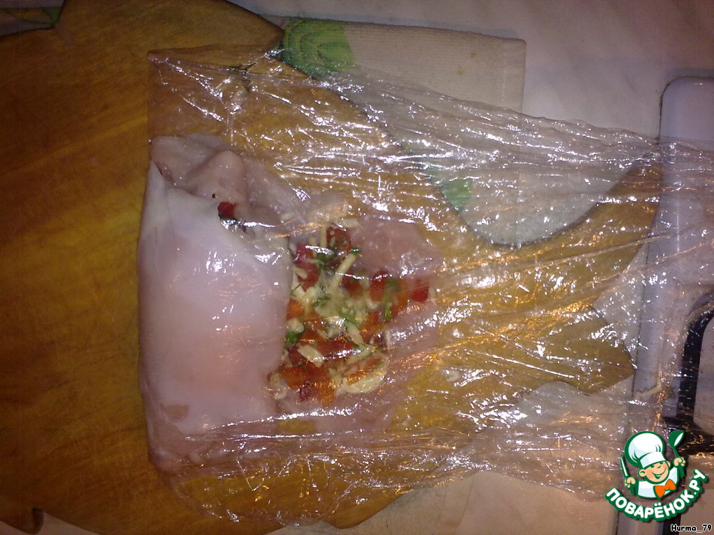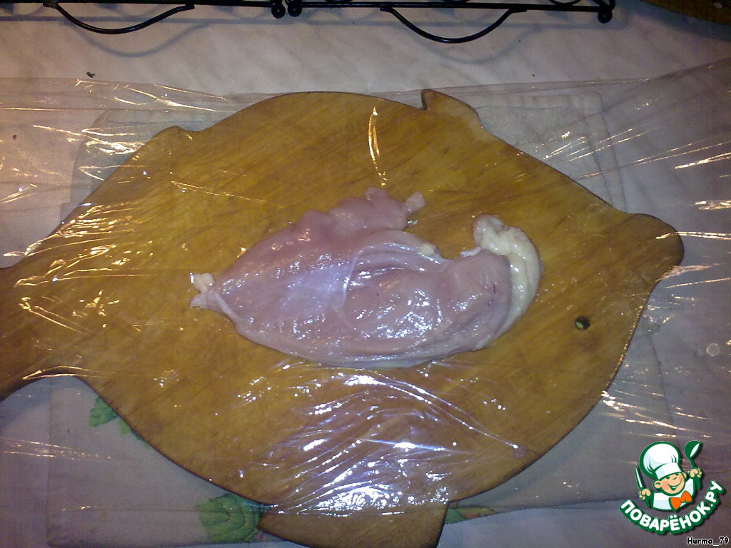 Филе накрываем пищевой пленкой и отбиваем боковой стороной молоточка.