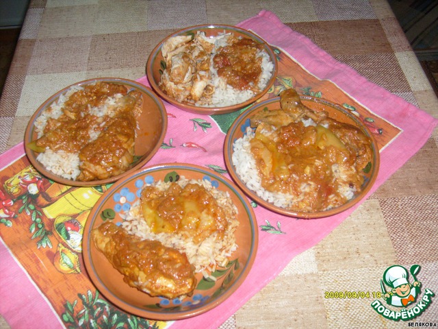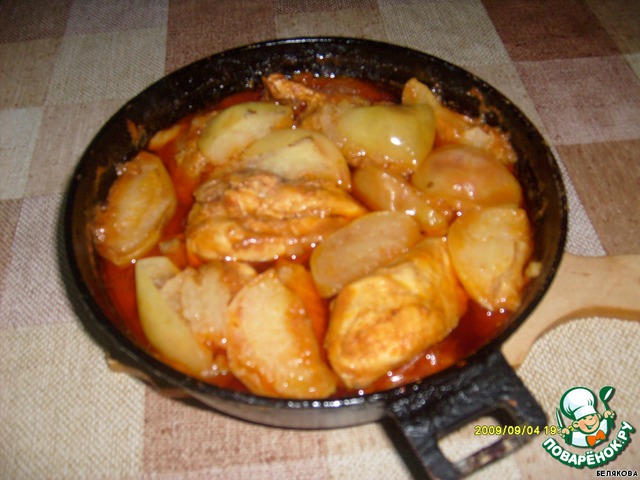 На этом рецепт заканчивался, на гарнир шел рис отварной. Но у меня лежало много зеленых яблок, и я решила добавить их туда....курица с яблоками вышла просто замечательная...ну фото, конечно, не очень....экспромт
