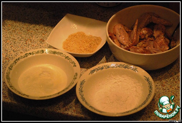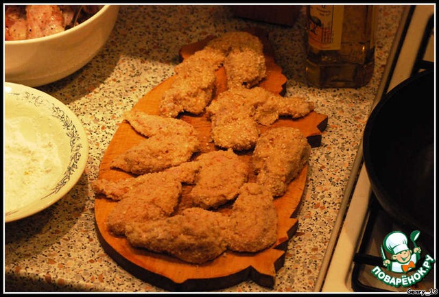 = Крылышки из маринада обваливаем в крахмале, обмакиваем во взбитые белки, обваливаем в сухарях с кунжутом, укладываем на доску.
