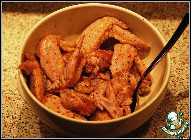 = Охлаждённые куриные крылышки промываем и сушим бумажными полотенцами. Разрезаем каждое крылышко на 2 части по суставу. Укладываем в блюдо и посыпаем молотым перцем.