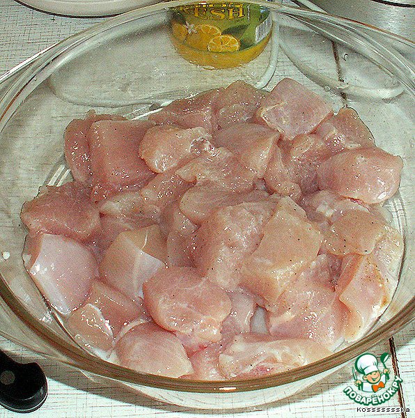 Филе режем не мелкими кубиками, складываем в миску, заливаем лимонным соком. Туда же сыплем кардамон, соль и перец. Перемешиваем и оставляем на 10 минут.