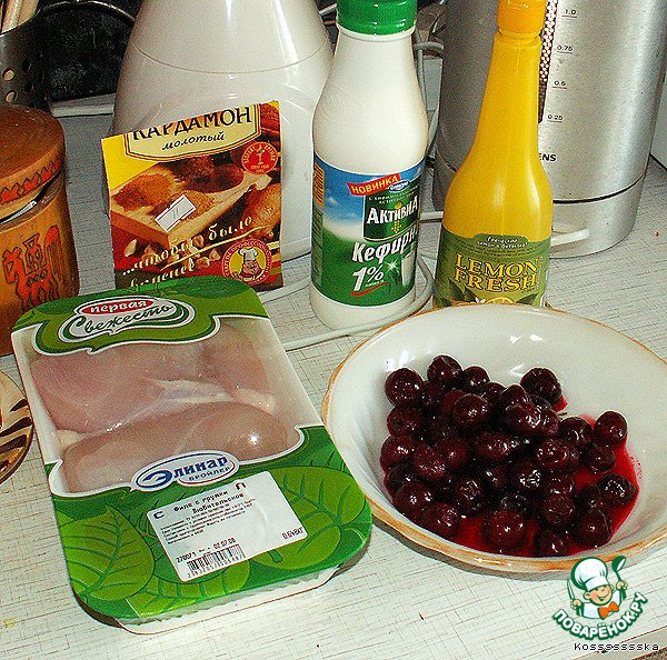Филе у меня было свежее и молодое, маринад впитало буквально сразу. Немного тепловой обработки в вишневом соке с кефиром – и она тает во рту. А кусочки вишни в соусе придают особый шарм и вкус. Получилось очень душисто и очень нежно. Да и выглядит необычно…