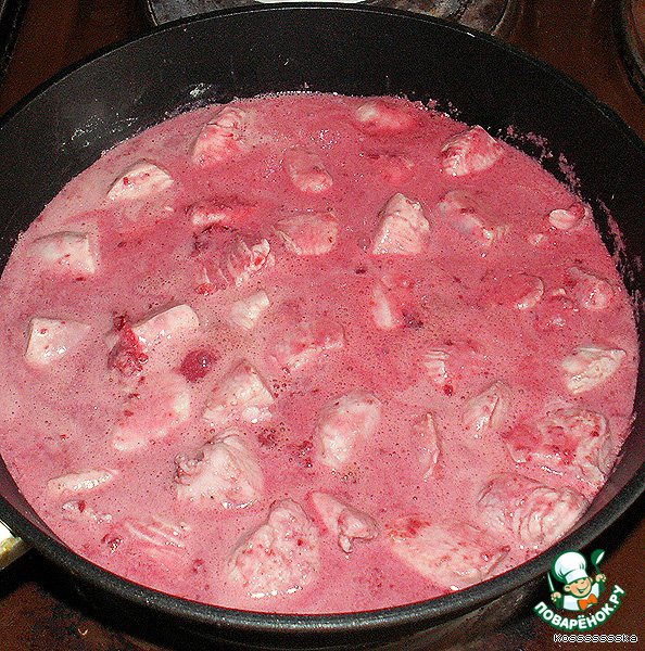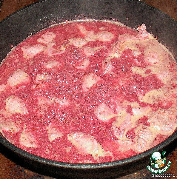 | Восхитительно яркая, ароматная и нежная курочка с ярко-розовой вишневой подливкой. |