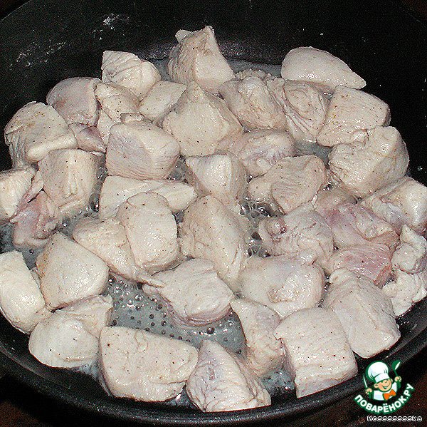 Разогреваем сковородку до максимума, прогреваем на ней курочку до белой корочки, помешивая – минуты три.