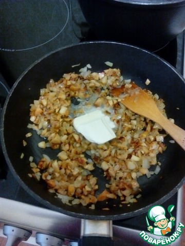 Мелко порубленые грибы жарим на сковороде с небольшим количеством растительного масла. Добавляем мелко нарезанный лук. В самом конце кидаем в сковороду ложку сливочного масла.