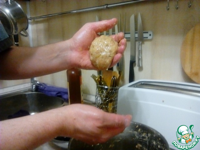 Пропускаем грудку на мясорубке. Через мясорубку пропускаем жареные грибы. В полученную массу разбиваем два яйца, вливаем молоко, сыплем манку. Солим, перчим, тщательно месим фарш. Руками формируем котлеты. Я, кидаю котлету из руки в руку, пока котлета не перестанет липнуть к ладоне.