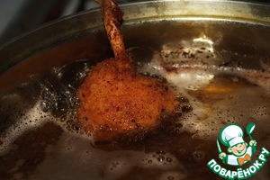 Затем маринад надо слегка отряхнуть, обмакнуть лоллипоп во взбитое яйцо или в смесь яйца с мукой и запанировать в сухарях. После этого отправляем во фритюр чикеновый чупа-чупс.. Это значит в большом количестве масла обжарить на среднем огне до золотистой корочки в течение 8-10 мин., то есть где-то по 4-5 мин. с каждой стороны.