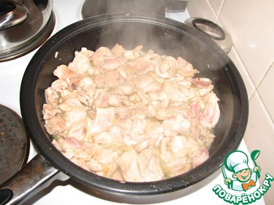 Переложим со сковороды грибы и обжарим на ней курицу до полуготовности. Посолим, поперчим ее, чтобы она пропиталась ароматом и вкусом.