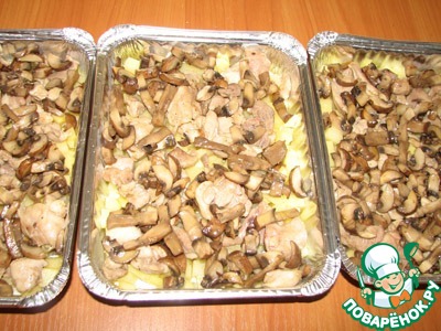 Теперь возьмем 3 лотка из фольги и на дно каждого из них положим картофель