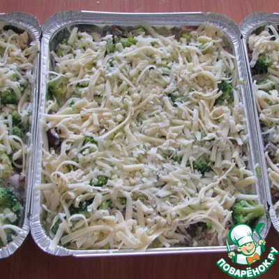 На всю эту красоту выложим потертый сыр и отправим в духовку на 30 минут. Через 30 минут снимем крышечки и оставим блюдо еще на 5-10 минут в духовке, чтобы сырная корочка подрумянилась
