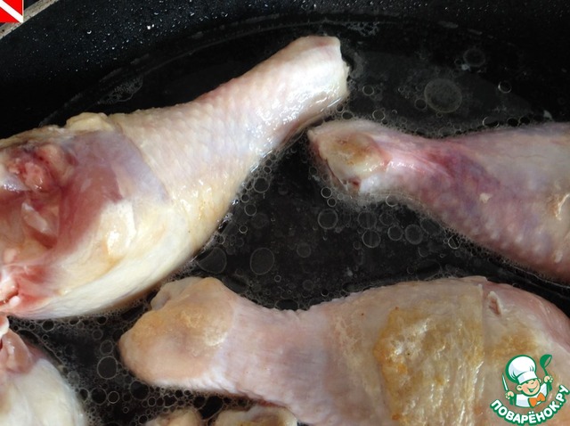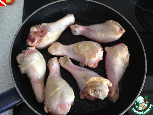 Выкладываем подготовленные кусочки курицы и слегка обжариваем со всех сторон. У меня сегодня голени, но с этим соусом нежным получается даже белое мясо.