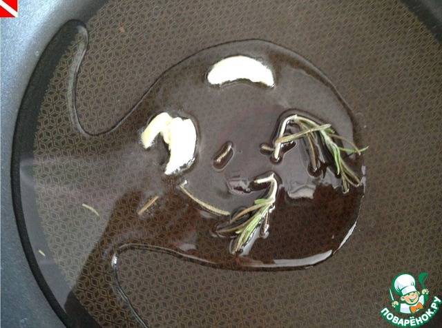 На разогретую сковороду кладем веточку розмарина и раздавленный зубчик чеснока. Через 1-1.5 минуты чеснок убираем - он уже отдаст свой аромат.