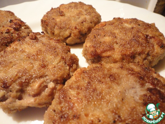 А тем временем из фарша формируем плоские круглые котлетки. Обваливаем их в панировочных сухарях и очень быстро на большом огне, буквально по 1 минуте с каждой стороны обжариваем их в том самом вытопленном курином жире.