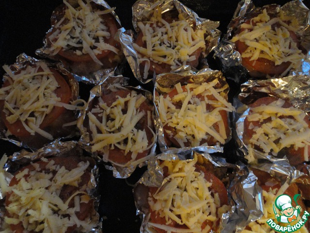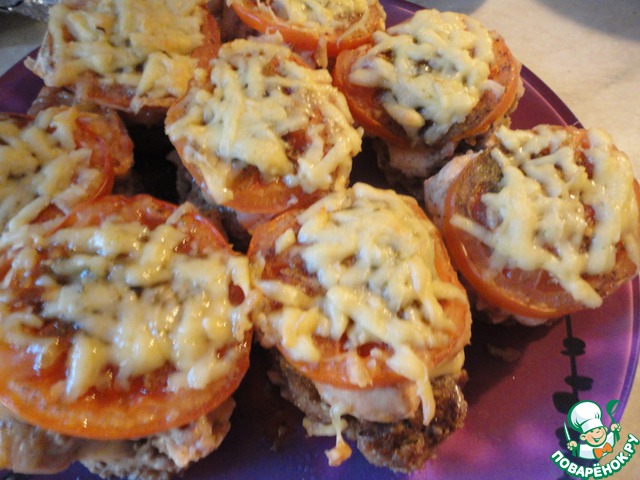 Сверху кладем кружок помидора. Его нужно ОБЯЗАТЕЛЬНО слегка подсолить, иначе он в готовом блюде будет пресным. Еще я помидор поперчила (если готовите деткам, то это можно не делать) и посыпала прованскими травами. Сверху помидор посыпаем тертым на крупной терке сыром и отправляем в духовку на 30 минут при 180-200 градусах.