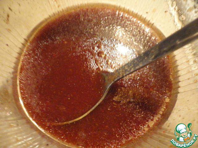 Для начала, я с вечера вынула фарш из морозильника, чтобы он к утру разморозился и замариновала куриное филе. Это один из моих любимых маринадов для курицы. Вообще прелесть курицы в том, что она очень легко принимает вкус любого маринада. Итак, из соевого соуса, лимонного сока, растительного масла, томатной пасты, меда и свежемолотого черного перца вилкой сбить маринад-эмульсию.