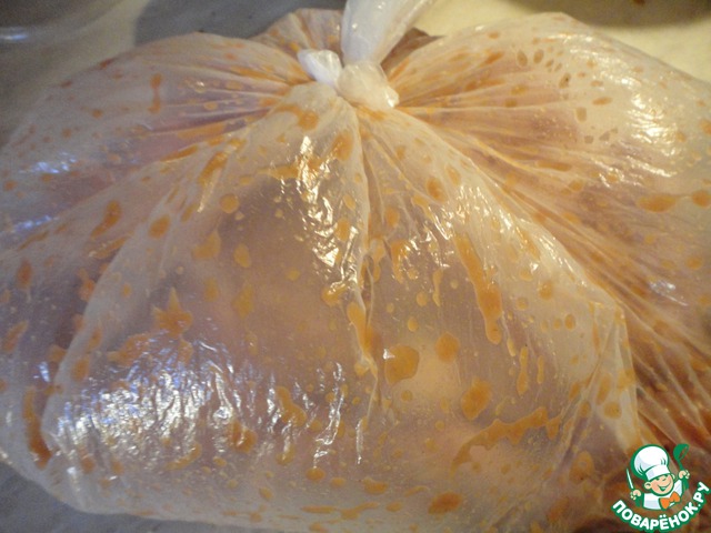 Завязываем пакет и очень хорошо его перетряхиваем, чтобы маринад равномерно распределился. Отправляем пакет в холодильник до утра для маринования.