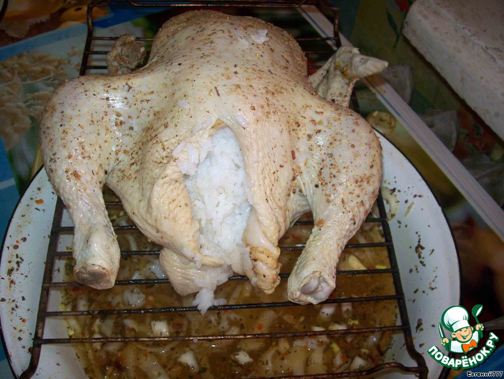 И набиваем рисом (при жарке он пропитается жирком и запахом курятины и дыма),