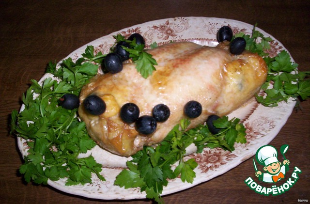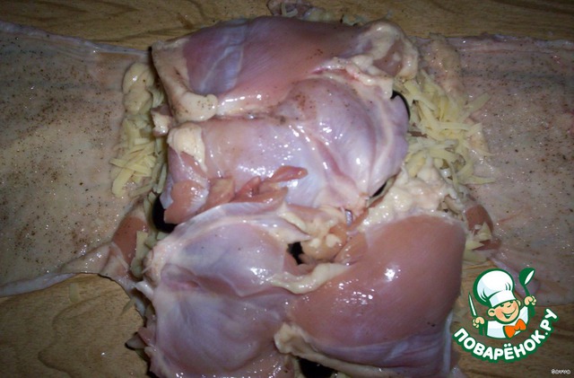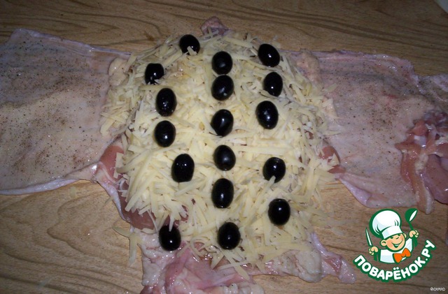 - Посыпать 1 /2 часть куриного мяса тертым на крупной терке сыром, положить в шахматном порядке маслины, накрыть второй половиной куриного мяса, завернуть в кожу, сформировав рулет, зафиксировать зубочистками.