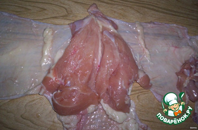 - Куриное мясо отделить от кожи, посолить, поперчить, разделить на две части.