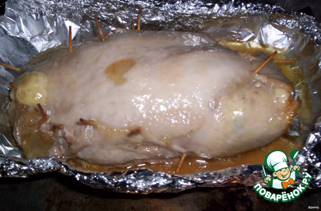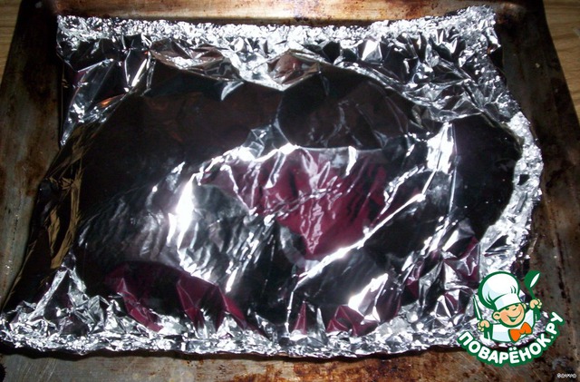 - Выпекать в разогретой до 300 t духовке 35 минут, раскрыть фольгу, выпекать 25 минут.