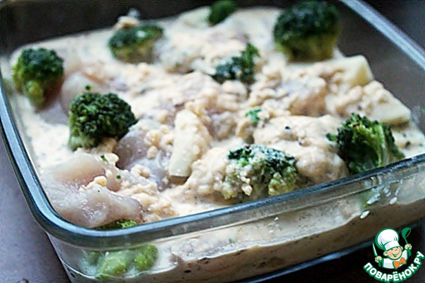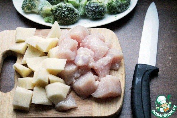 Филе нарезать кубиками, и соцветия брокколи (у меня из морозилки) должны быть примерно такого же размера.