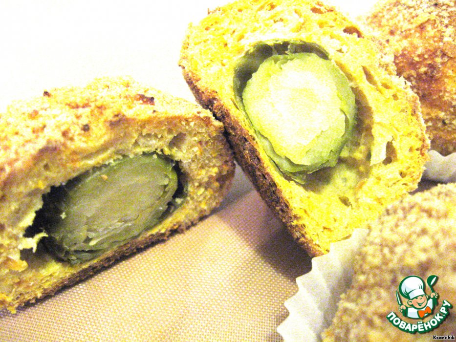Влажными руками делаем тоненькие лепешки из фарша, в центр лепешки помещаем кочанчик брюссельской капусты, аккуратно защипываем и скатываем шарик, обваливаем его в панировочных сухарях и укладываем на противень.