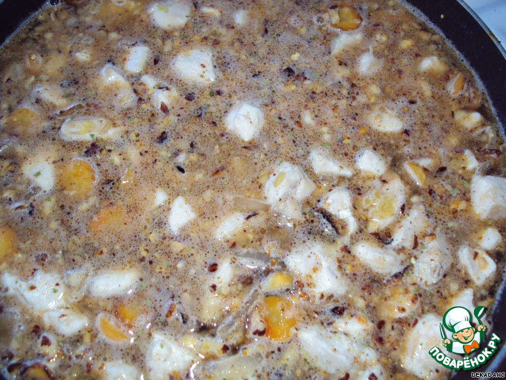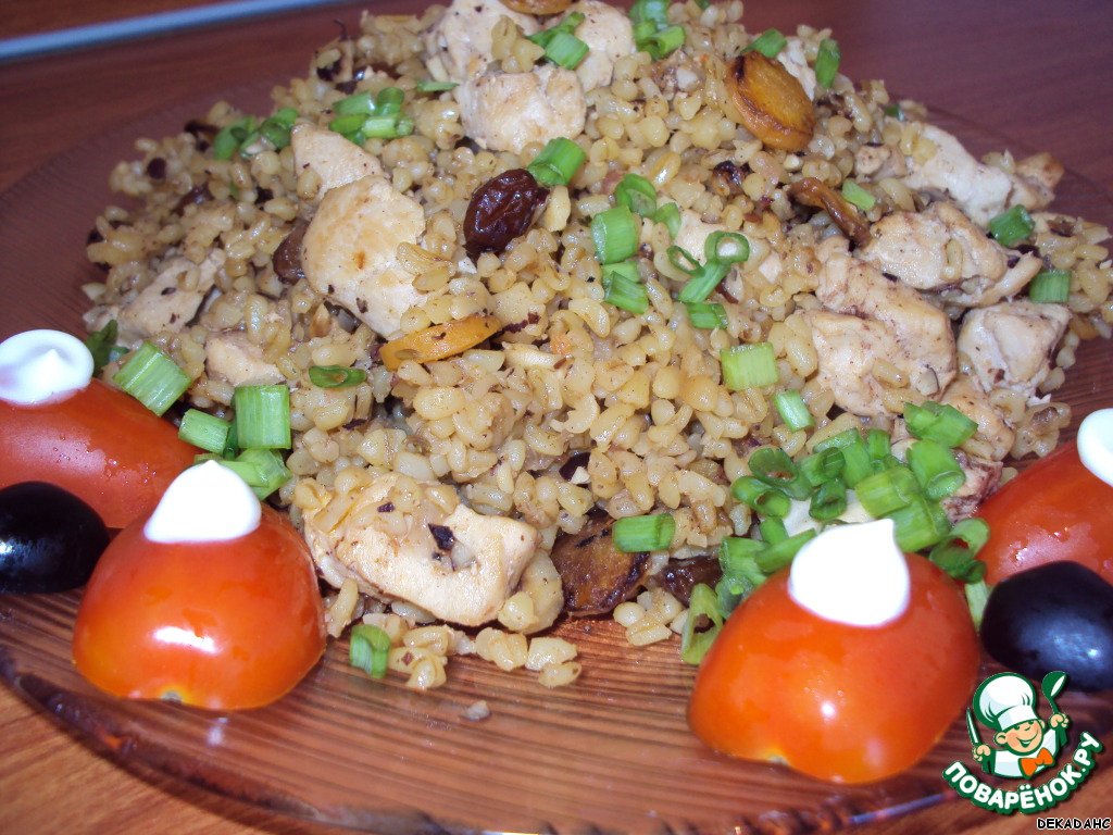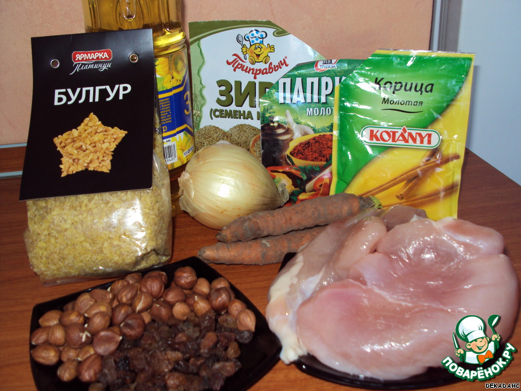 К зажарке добавить куриное филе, булгур, корицу, изюм, соль, перец и бульон. Оставить томиться на медленном огне 20 минут.