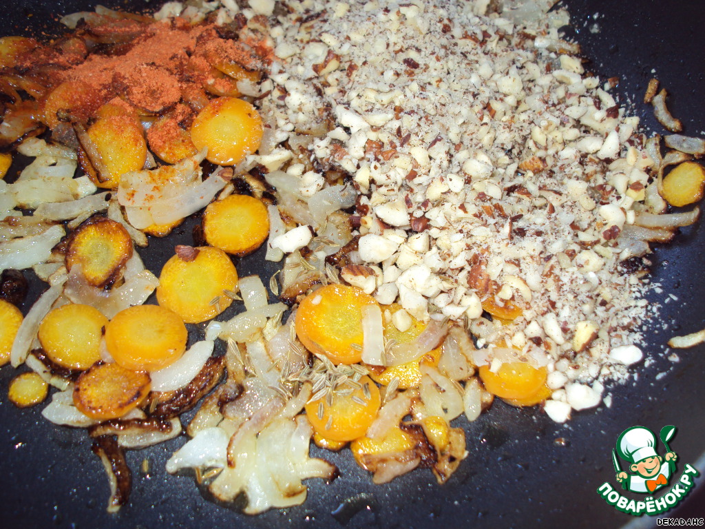 Морковь и лук обжарить, добавить зиру, паприку, молотый фундук.