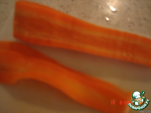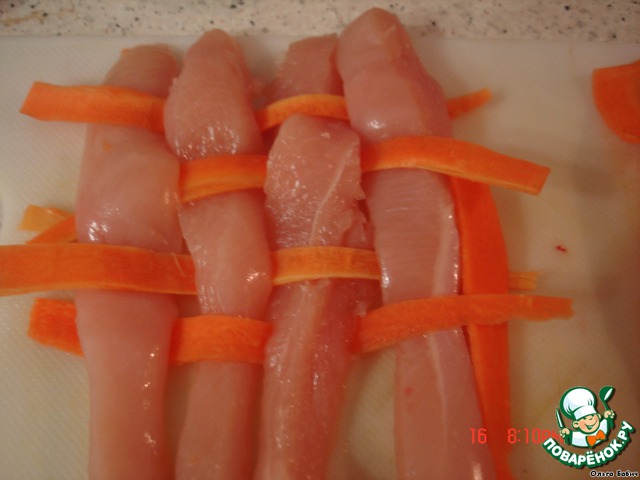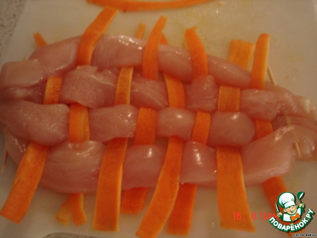 Начинаем скручивать (как на уроках труда), протягивая морковку между полосками мяска.