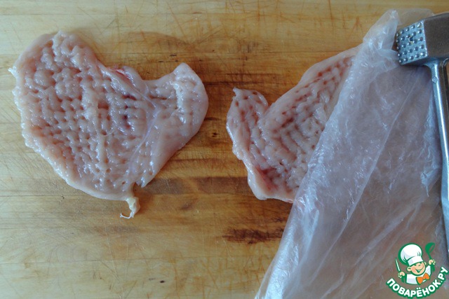 Разрезать куриное филе вдоль не до конца, развернуть и отбить. Отбивать через пищевую пленку или полиэтиленовый пакет, чтобы нежное куриное мясо не порвалось.