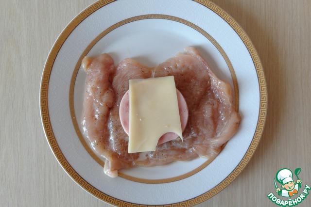 На филе уложить начинку следующим образом: ломтик сыра- ломтик ветчины- ломтик сыра. Плотно завернуть начинку в филе, подгибая края пласта мяса.