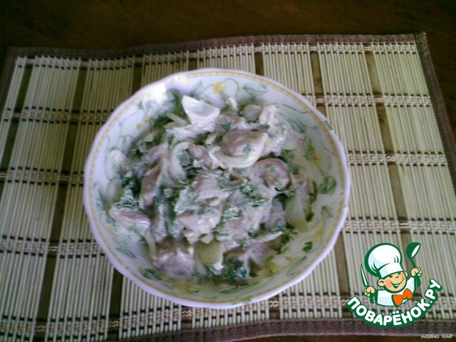 Добавить майонез, горчицу, укроп, петрушку, лук, соль, перец.