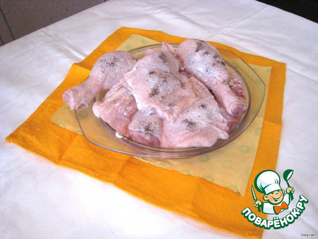 Посыпаем кусочки курицы солью и перцем.