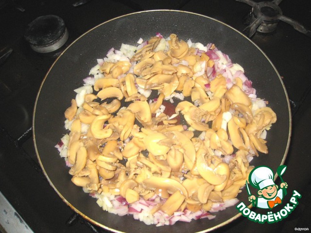 Мелко нарезаем репчатый лук, добавляем шампиньоны и слегка обжариваем на сковороде Scarlett.