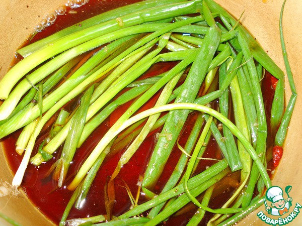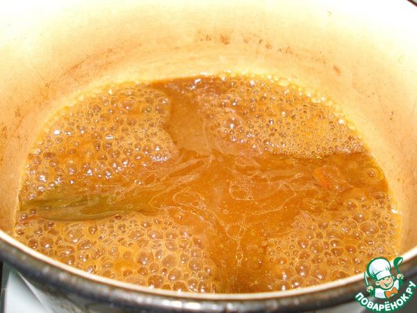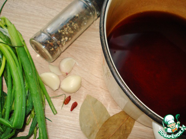 В кастрюле смешаем соевый соус, воду, рисовый уксус, раздавленный чеснок, добавим перец, лавровый лист.