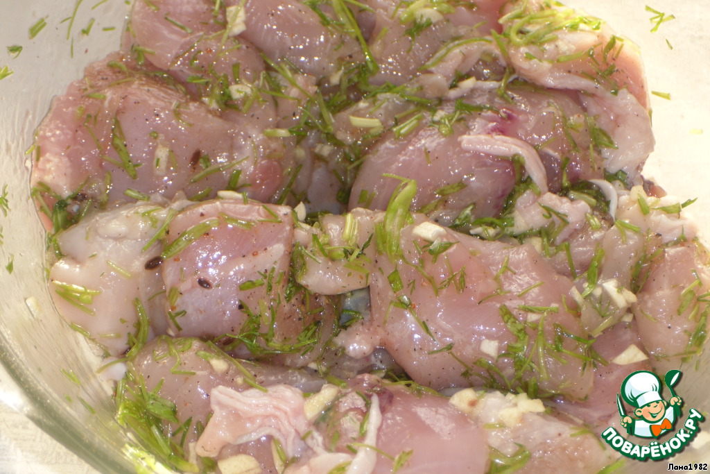 Куриное филе нарезать кубиками. Добавить к мясу мелко рубленный укроп, чеснок, цедру мандарина, растительное масло. Посолить, поперчить и оставить мариноваться на 30 минут.
