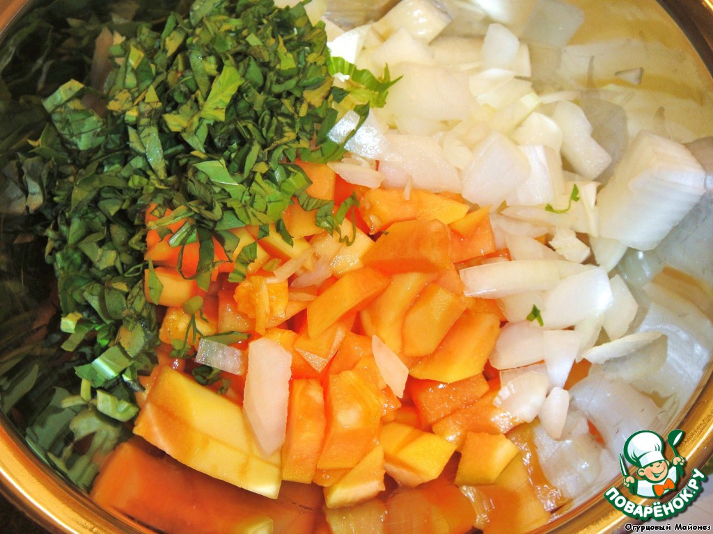 Мелко рубим репчатый лук и базилик, добавляем к папайе.