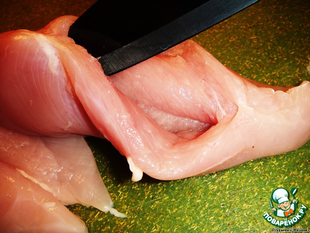Промываем куриные грудки, обсушиваем их салфеткой и делаем в каждой глубокий горизонтальный надрез, чтобы получился «кармашек».