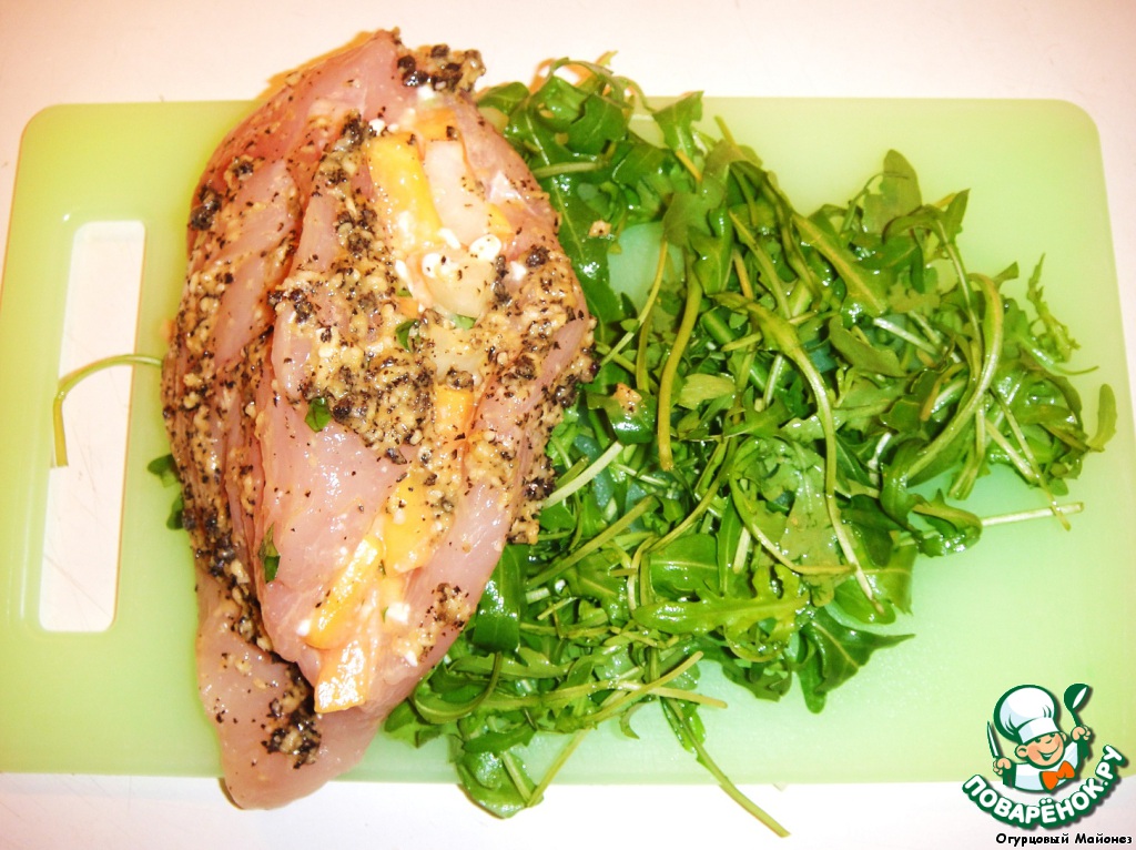 Натираем каждый кусочек курицы смесью из блендера. На отдельной доске раскладываем рукколу.
