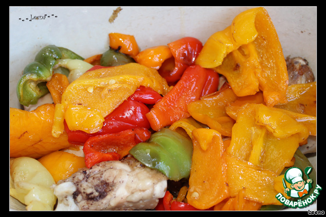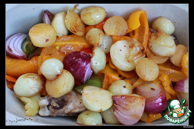Очищенный болгарский перец рвем руками на 4 части вдоль, обжариваем до легкой румяности в той же сковороде, где жарилась курица. Кладем в жаропрочную посуду поверх курицы.