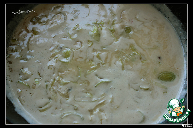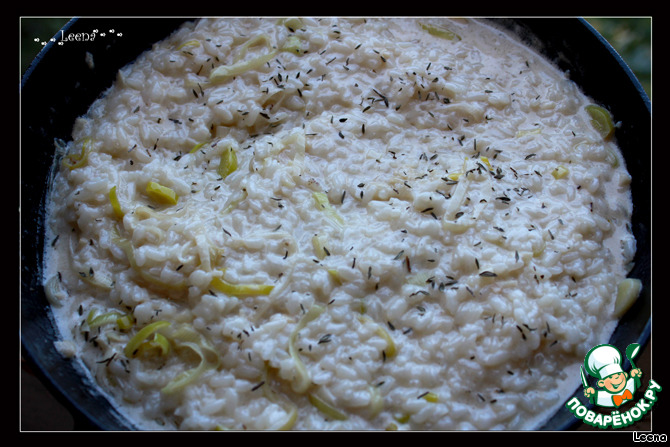 Тем временем готовим гарнир. Тонко порезанные чеснок и лук-порей обжариваем на оливковом масле. Затем добавляем вино, даем ему немного выпариться.