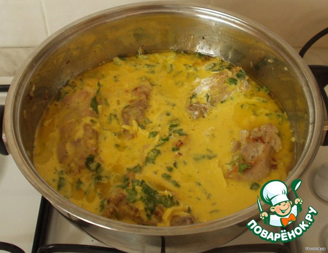 Готовую курицу залить яичной заливкой.