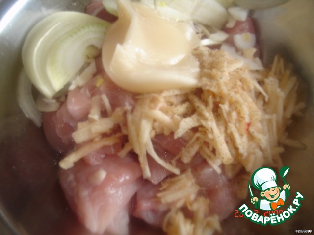 добавить к нему мёд+лук полукольцами+яблоко очищенное и тёртое на крупной тёрке (половинку тёртого яблока отжать в филе)