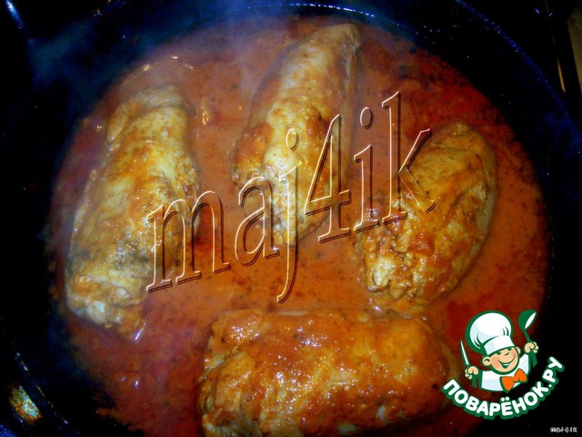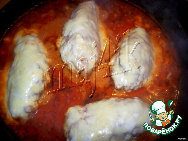 Сочные рулетики из куриной грудки в томатно-винном соусе, да под сливочно-сырной шапкой