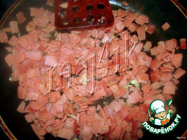 Ветчину нарезать квадратиками и обжарить на сливочном масле.