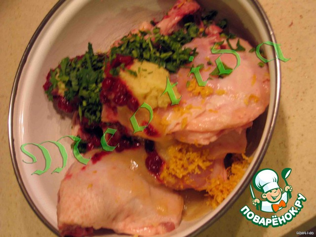 хорошенько смешиваем курочку, цедру, брусничное и грушевое пюре, имбирь, зелень, мускатный орех, соль и перчик и отправляем в холодильник мариноваться часов на 6