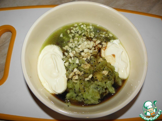 Подготовить маринад: киви натереть на терке ( можно блендер), чеснок измельчить, добавить соевый соус, майонез, сахар и лимон.., все перемешать