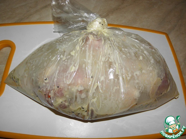 Положить курицу вместе с маринадом в пакет для запекания. Разогреть духовку 180-200% и запекать в течении часа. ( маринад превратится в соус). Можно сделать с вариантом простого запекания в форме.., только время приготовления сократить. в пакете очень вкусно..